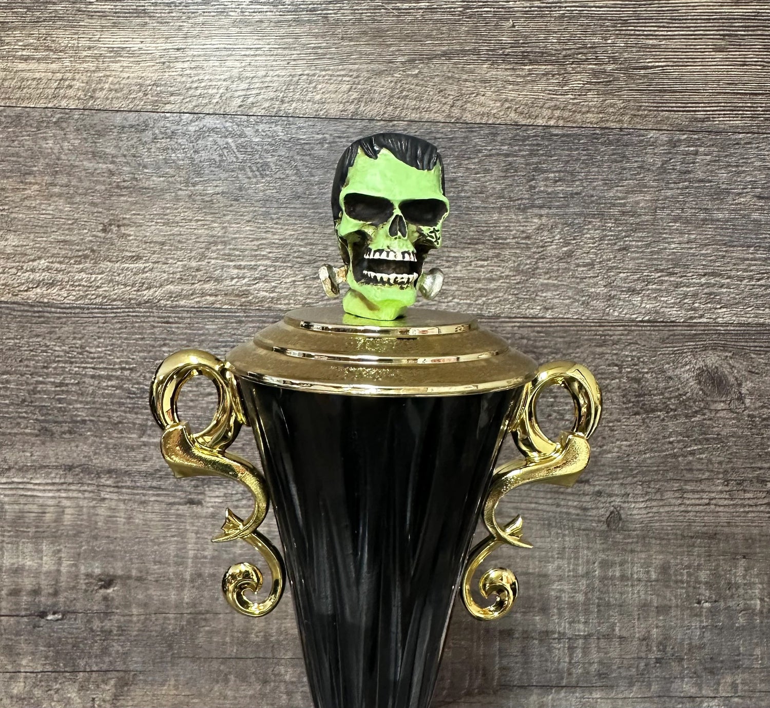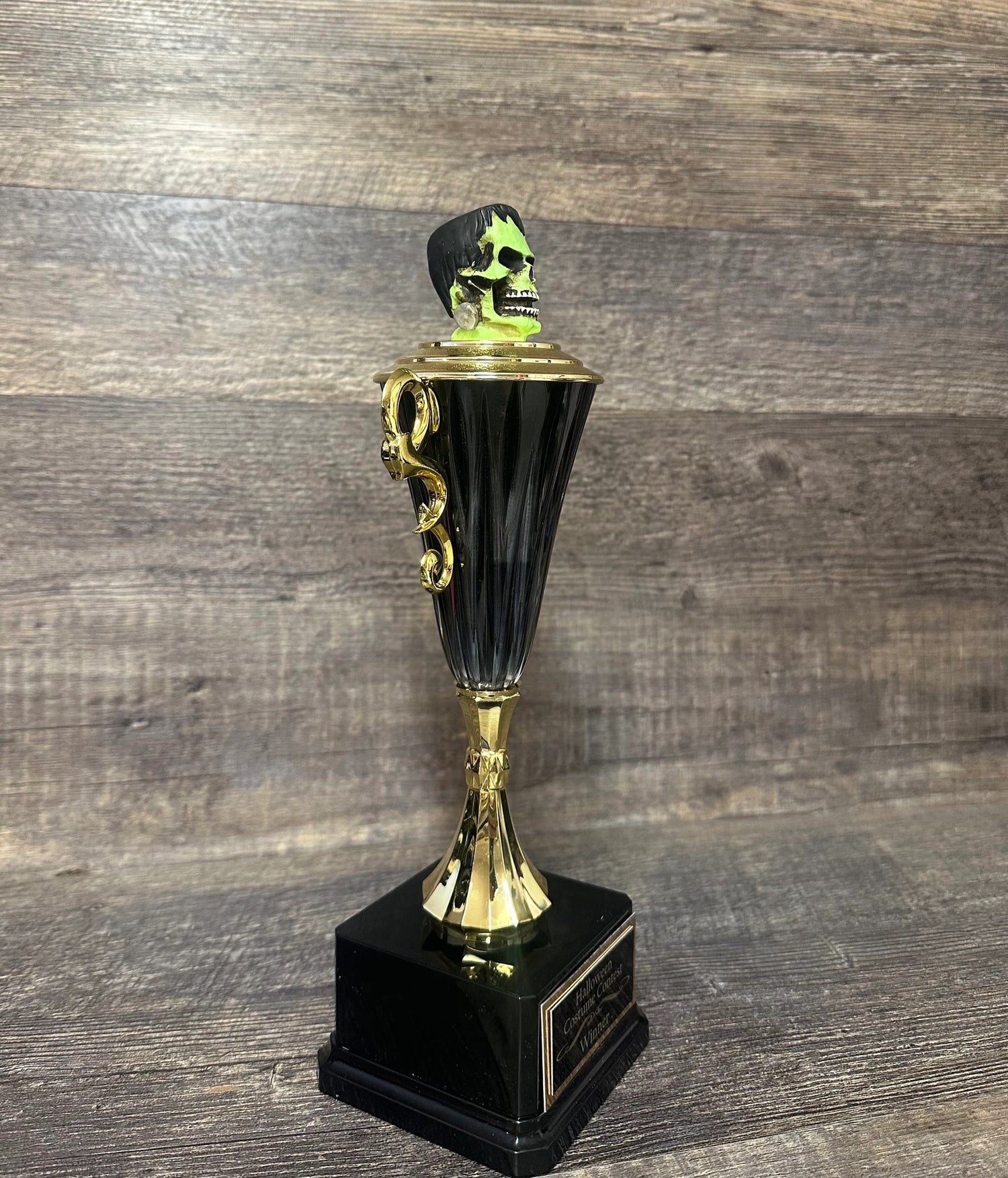 This is a 12" Halloween trophy created out of black crystal like cup with a green beast head on top. We will custom engrave the tag for you.