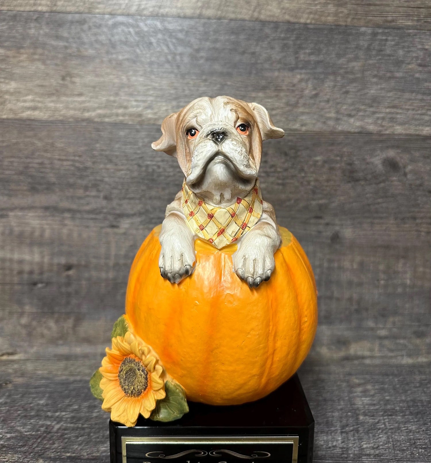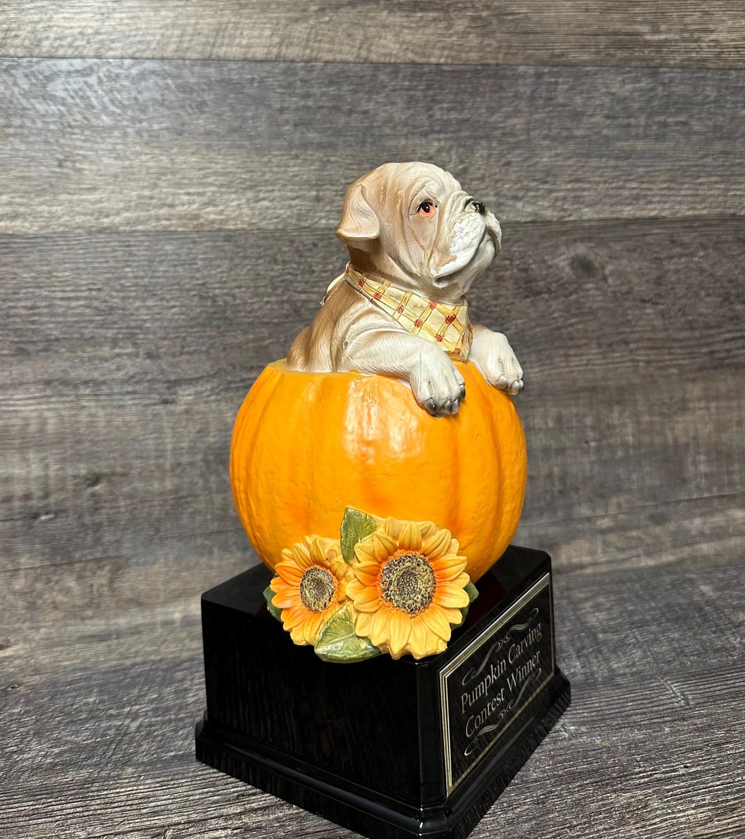 This is an XL 10.5" Bulldog Halloween trophy or Howl-O-Ween trophy with a super cute resin puppy dog in a pumpkin. We will custom engrave the tag for you.
